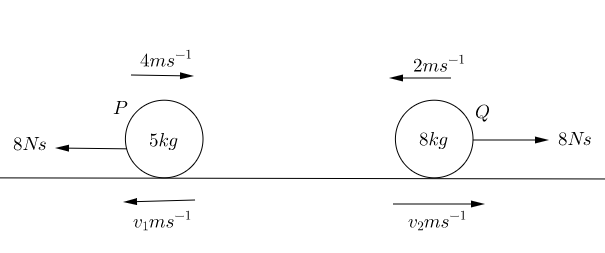 Two particles $P$ and $Q$ of mass $5 \mathrm{kg}$ and $8\mathrm{kg}$ respectively are moving towards each other along the same straight line. The surface is smooth and horizontal and the particles move at speeds $4 \mathrm{ms^{-1} }$ and $2 \mathrm{ms^{-1} }$ respectively. $P$ and $Q$ collide. The magnitude of the impulse due to the collision is $8 \mathrm{Ns}$. What is the speed and direction of each particle after the collision?